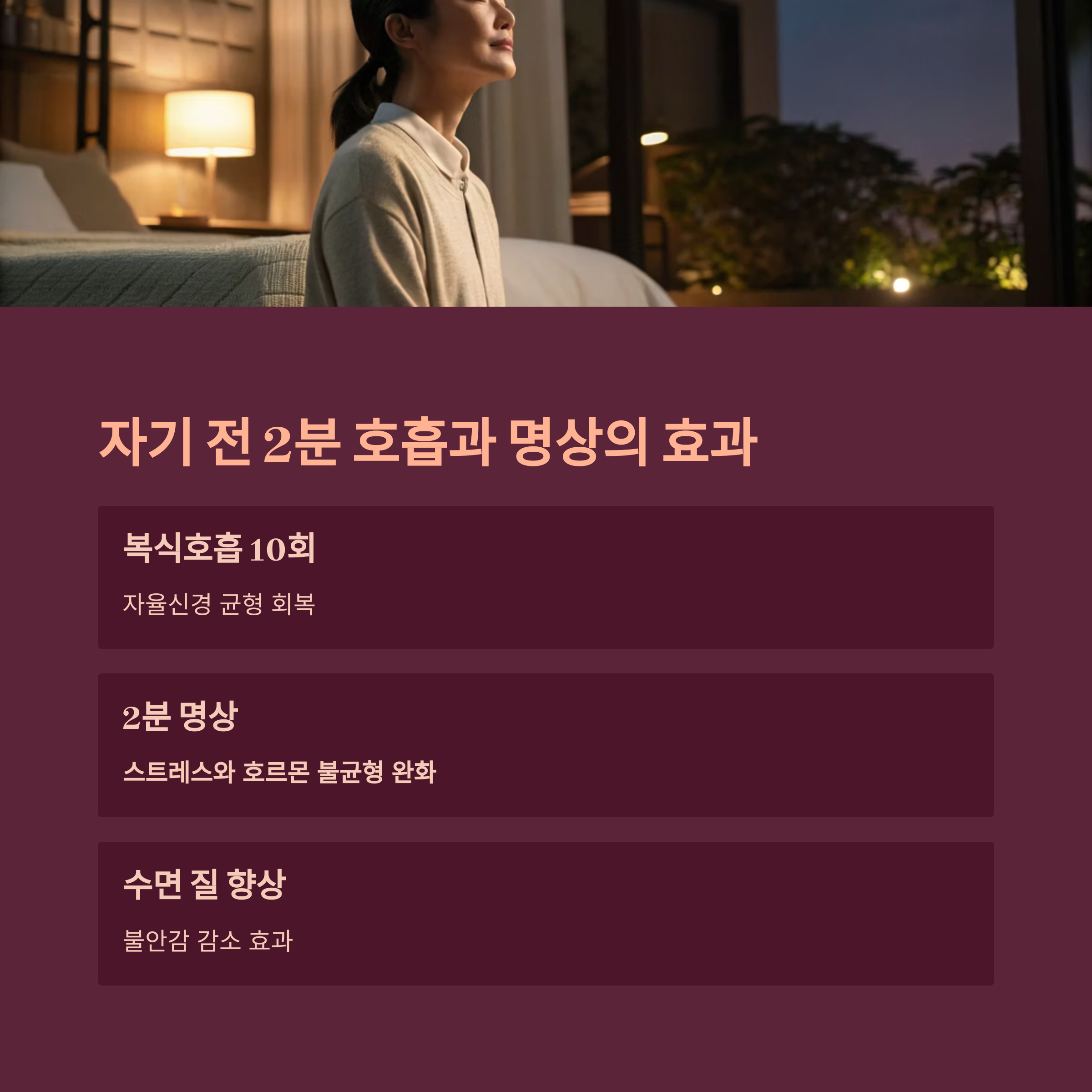 잠들기 전 깊은 호흡과 짧은 명상 루틴은 자율신경 균형을 맞추고,