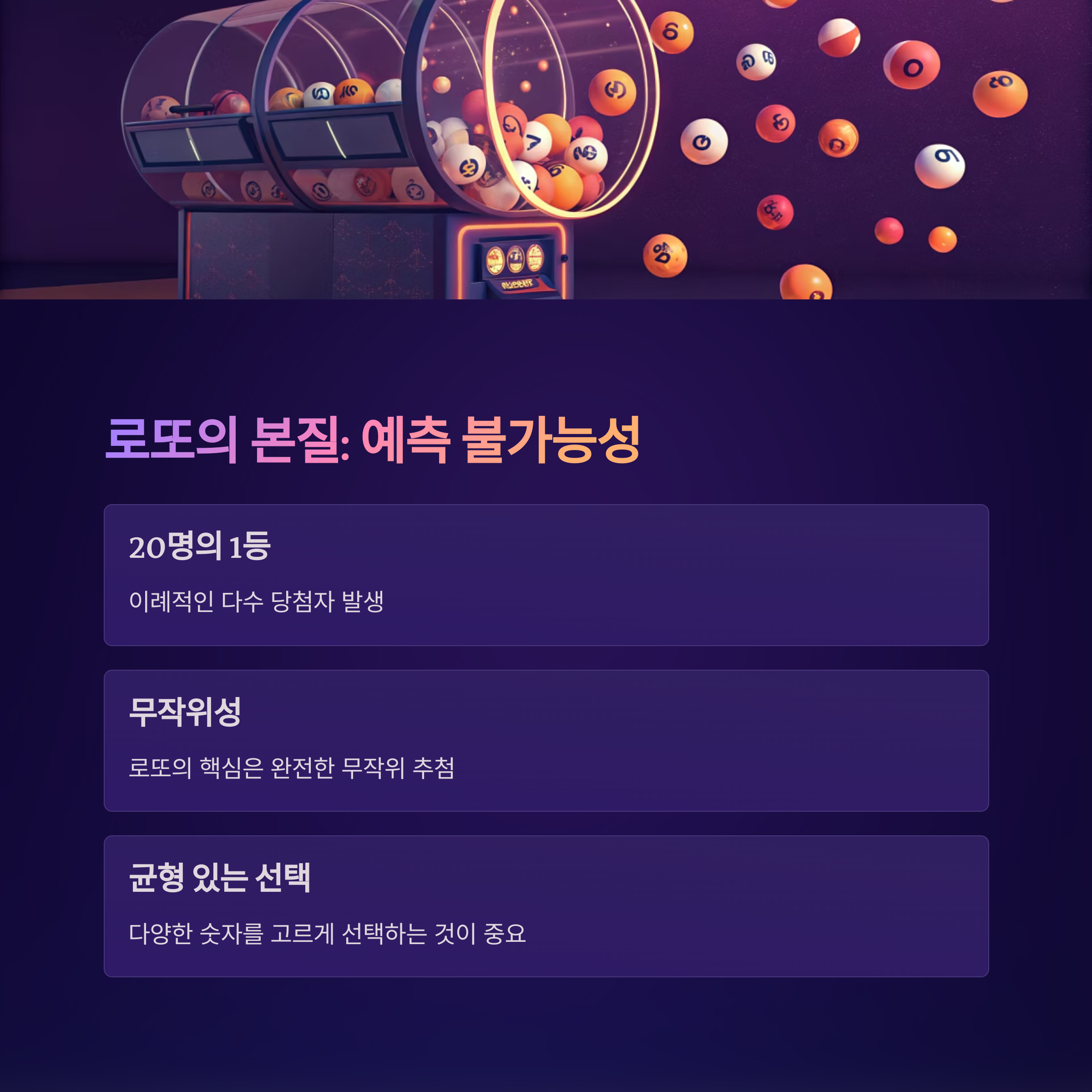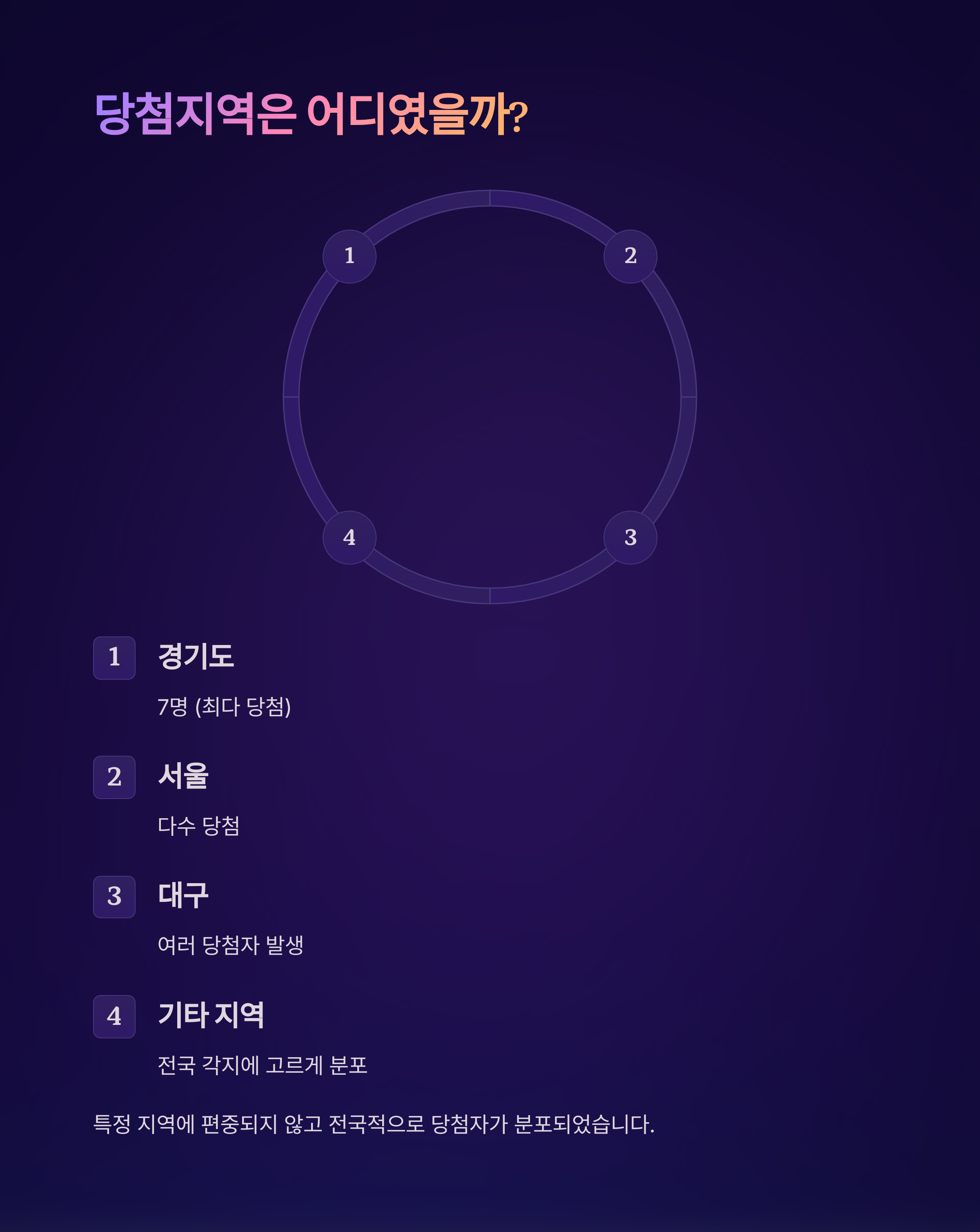 1등 당첨자 20명의 지역 분포를 살펴보면, 경기도에서 7명이 나와 가장 많았으며, 서울, 대구, 강원도 등 전국 각지에서 고르게 나타났습니다 . 이는 특정 지역에 편중되지 않고 전국적으로 당첨자가 분포되었음을 의미합니다.