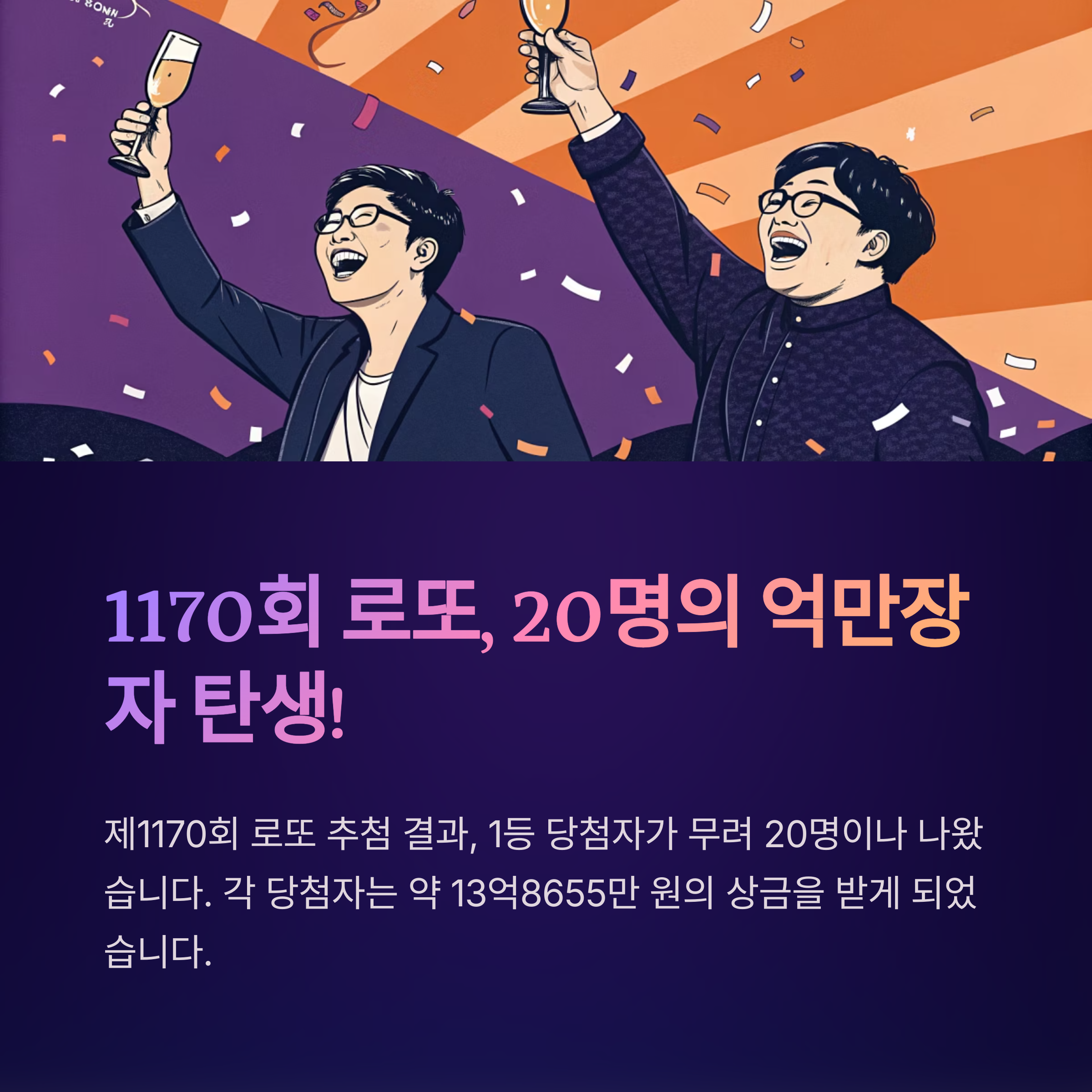 제1170회 로또 추첨 결과, 1등 당첨자가 무려 20명이나 나왔습니다. 각 당첨자는 약 13억8655만 원의 상금을 받게 되었는데요. 이번 회차의 당첨번호와 그 배경에 대해 자세히 알아보겠습니다.