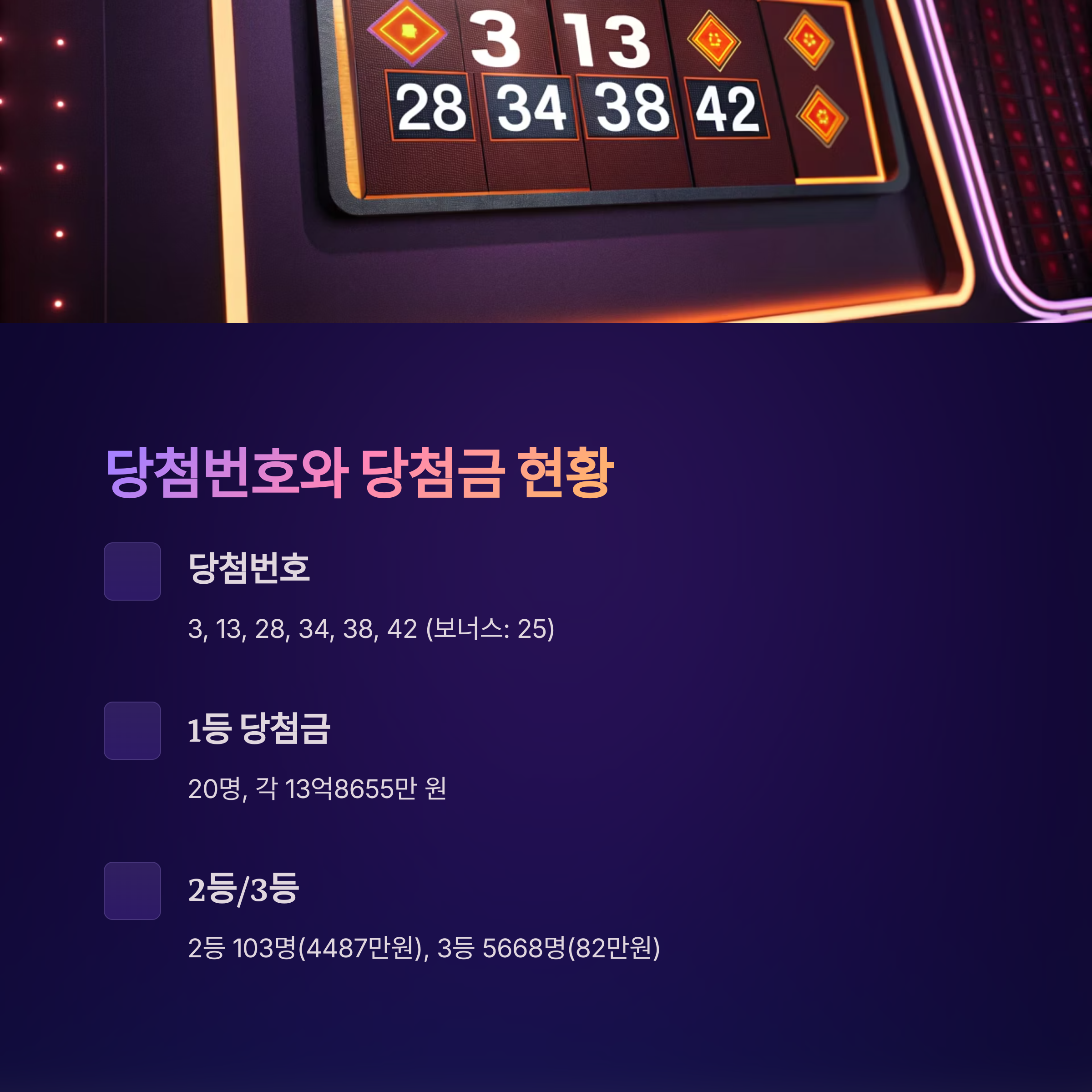 이번 회차의 1등 당첨번호는 '3, 13, 28, 34, 38, 42'이며, 보너스 번호는 '25'입니다. 1등 당첨자는 총 20명으로, 각자 13억8655만 원을 수령하게 됩니다 . 2등은 103명으로 각 4487만 원, 3등은 5668명으로 각 82만 원을 받게 됩니다.