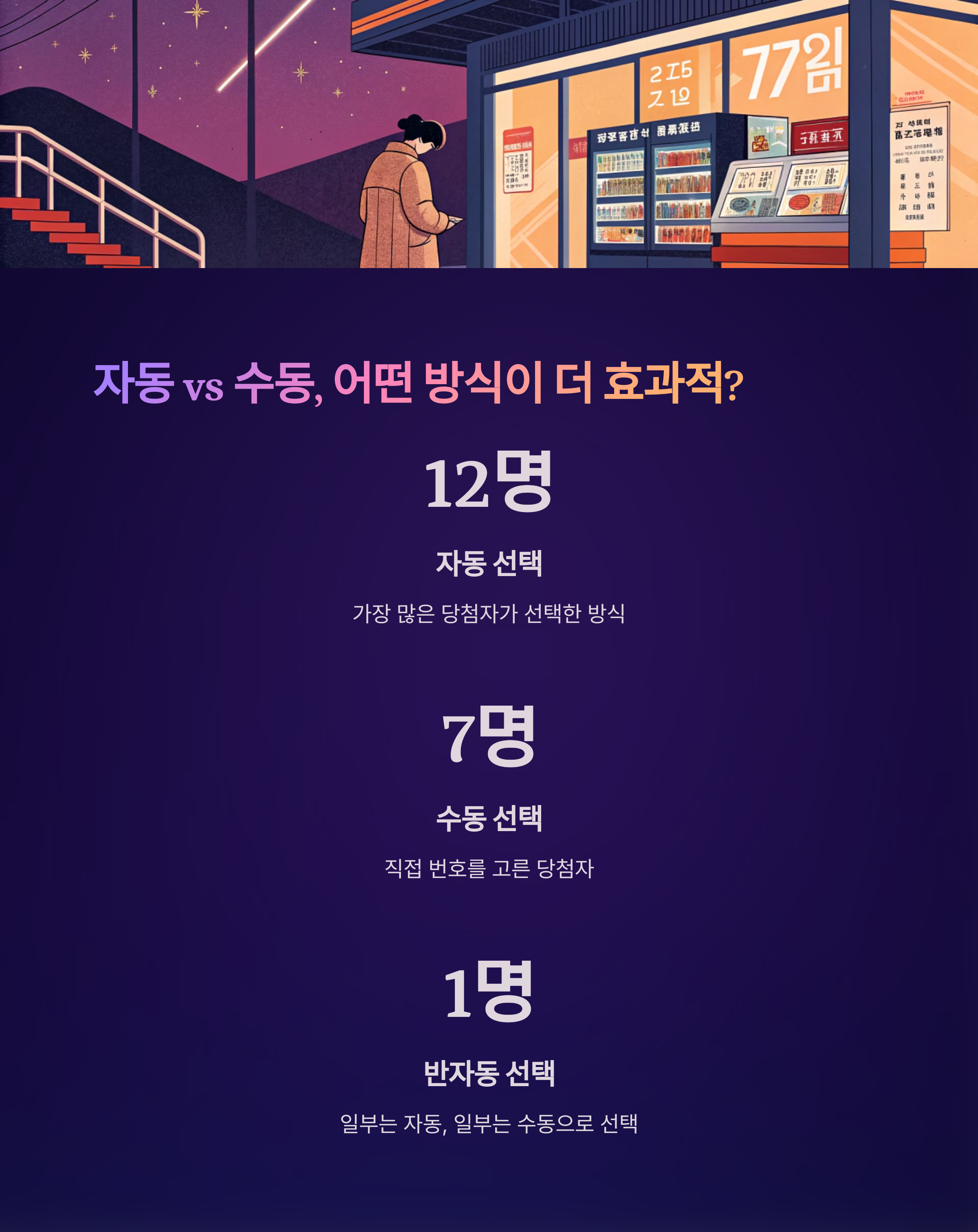 1등 당첨자의 번호 선택 방식을 보면, 자동 선택이 12명, 수동 선택이 7명, 반자동 선택이 1명이었습니다 . 이는 자동 선택이 여전히 많은 사람들에게 선호되고 있음을 보여줍니다.