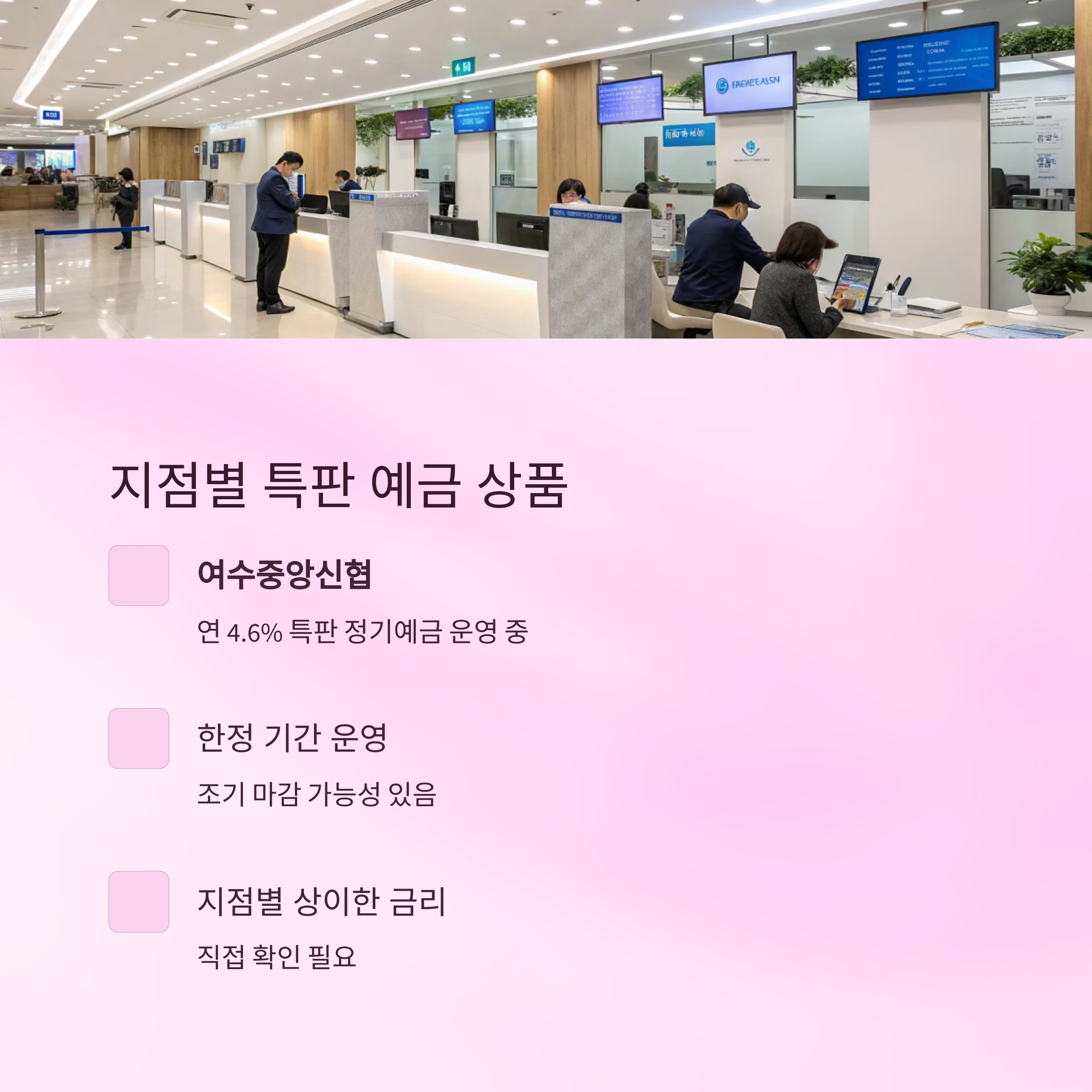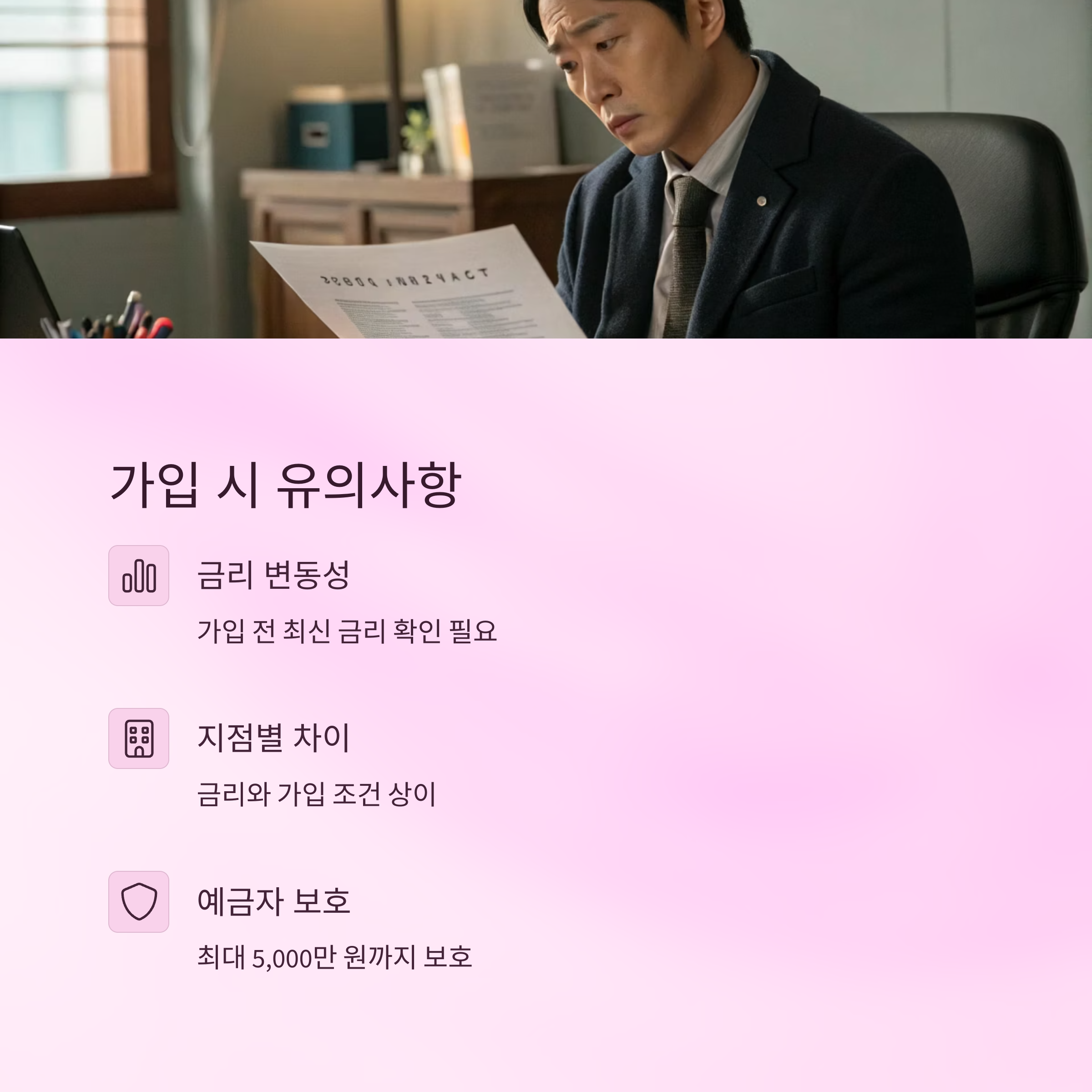 - 지점별 차이: 지점마다 금리와 가입 조건이 상이하므로, 직접 확인이 필요합니다.