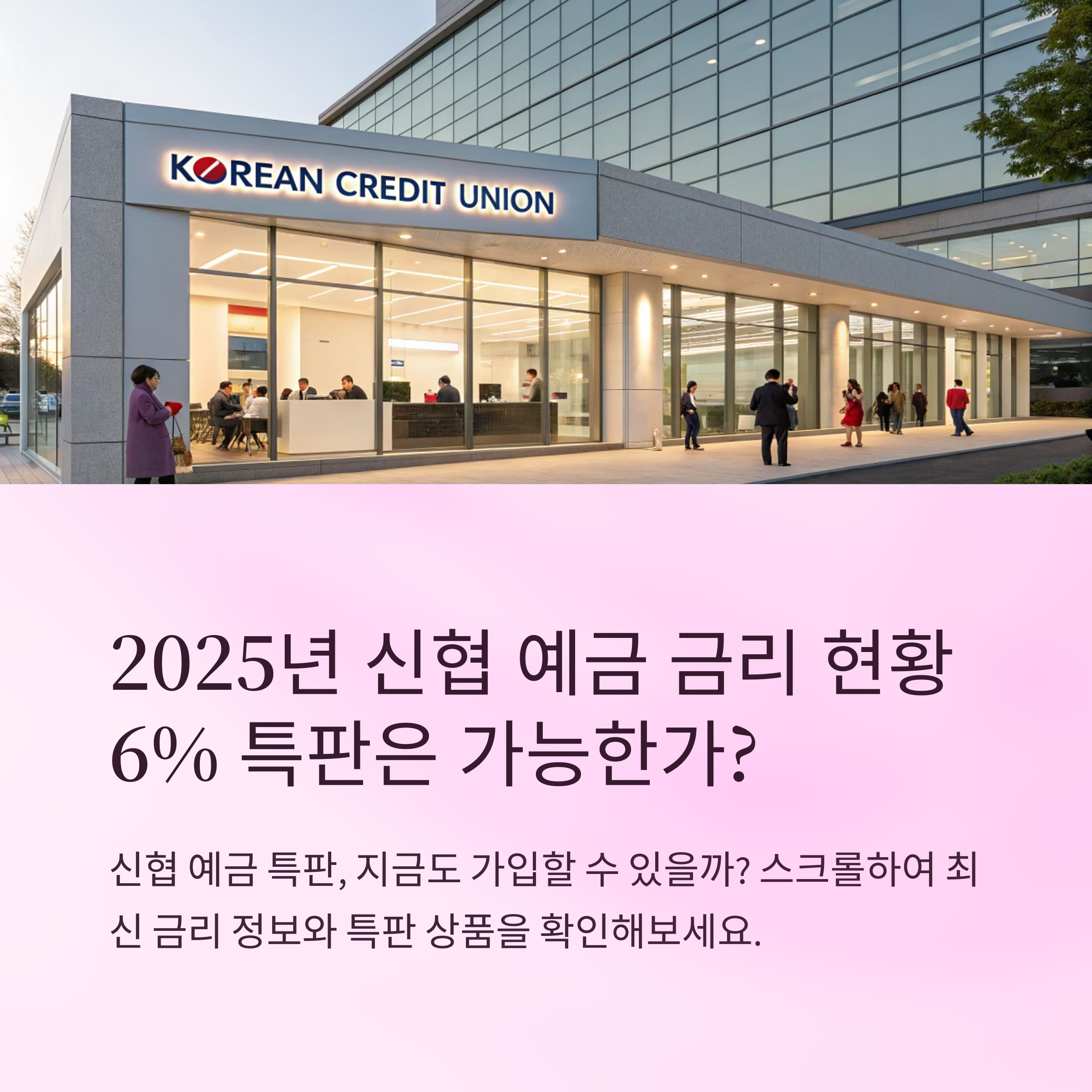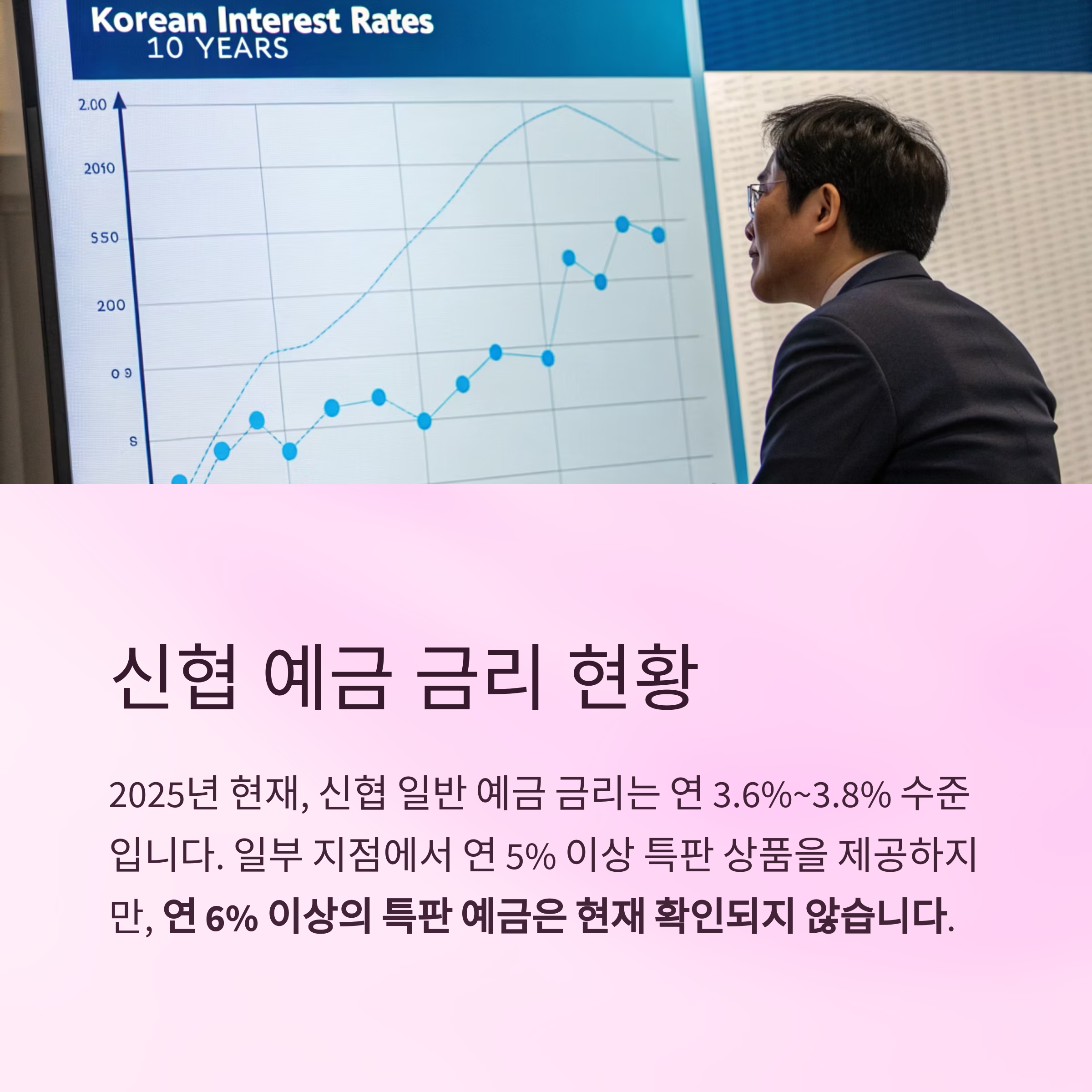 2025년 현재, 신협의 예금 금리는 일반 상품 기준으로 연 3.6%~3.8% 수준입니다. 특판 상품의 경우, 일부 지점에서 연 5% 이상의 금리를 제공하고 있으나, 연 6% 이상의 특판 예금은 현재 확인되지 않습니다. 따라서, 6% 이상의 금리를 원하신다면 적금 상품을 고려하시는 것이 좋습니다.