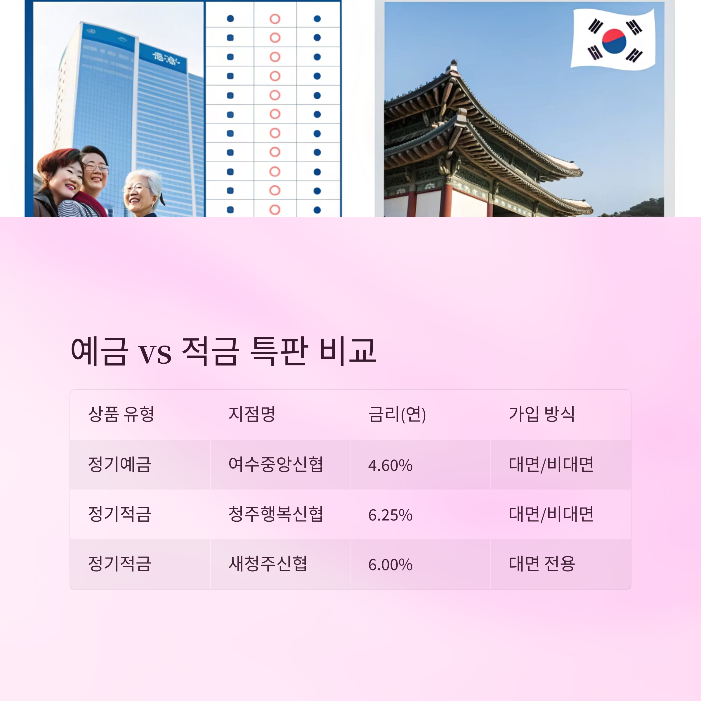 | 정기예금 | 여수중앙신협 | 4.60% | 대면/비대면 | 한도 소진 시 마감 |