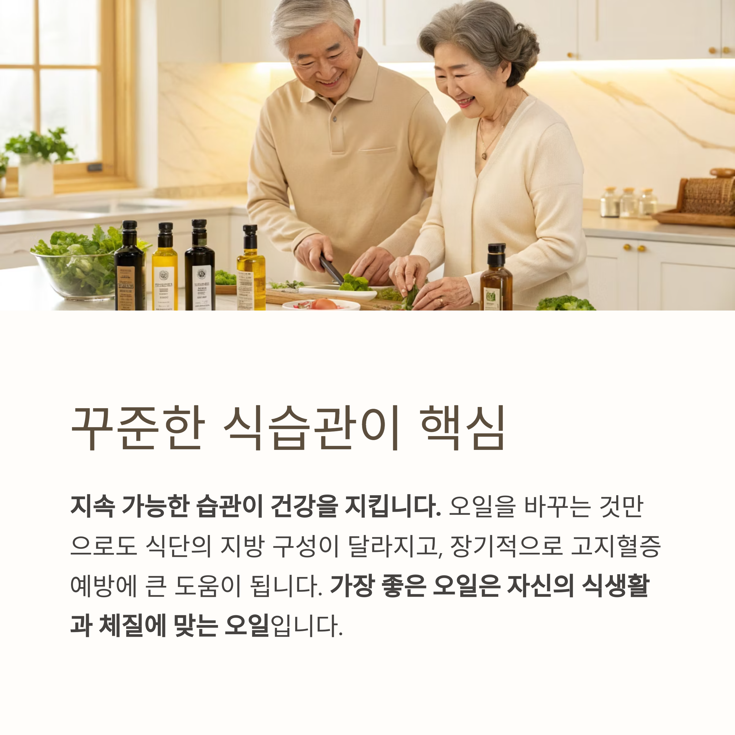 오일을 바꾸는 것만으로도 식단의 지방 구성이 달라지고, 장기적으로 고지혈증 예방에 큰 도움이 됩니다.