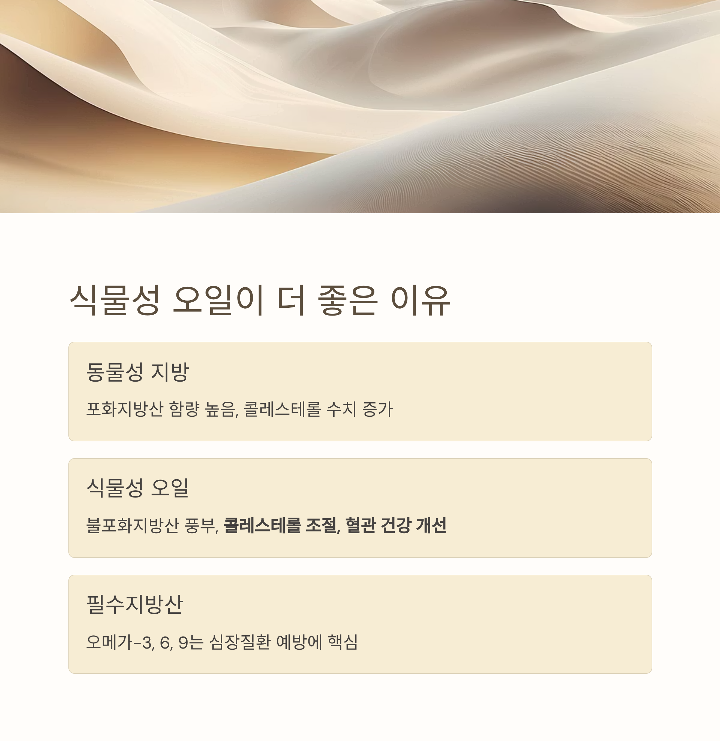 반면 식물성 오일은 불포화지방산이 풍부해 콜레스테롤 수치를 조절하고 혈관 건강에 도움을 줍니다.